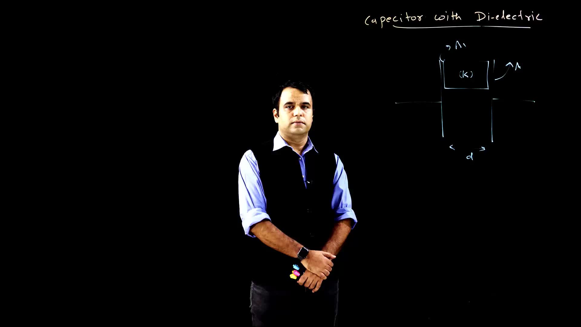 Calculation of capacitance of a capacitor with a dielectric material inside. Derivation of the formula and comparison with the formula for capacitance without a dielectric. Use of the formula to solve for capacitance.