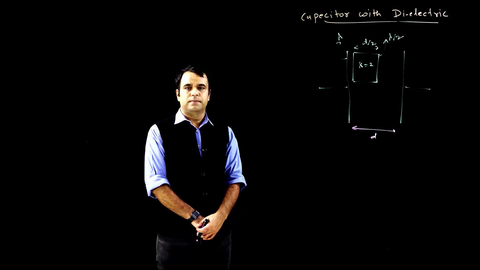 A lecture on how to calculate the capacitance of a capacitor with a partially filled dielectric, including the process of cutting and reattaching portions of the dielectric to calculate the effective capacitance of the system.
