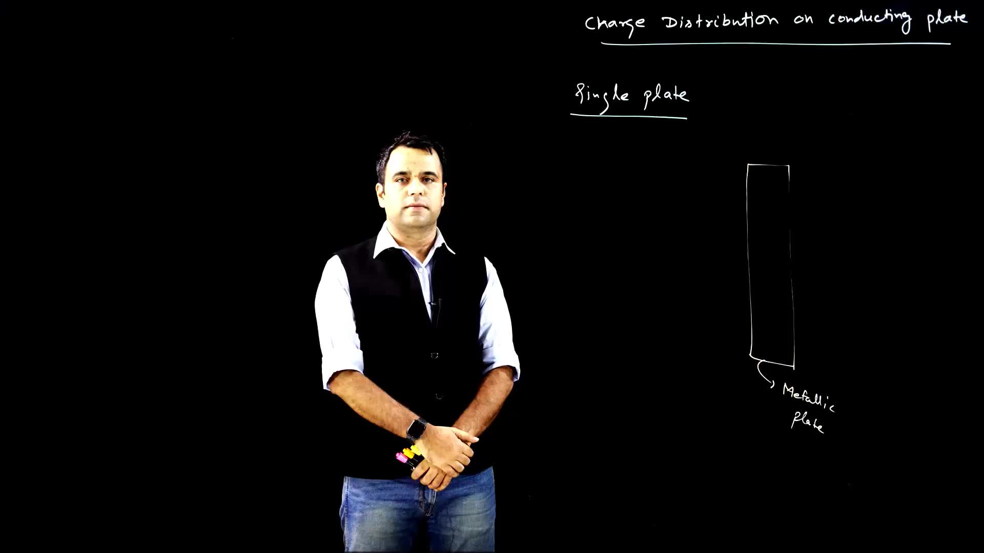 The video discusses how charge gets distributed on a metallic plate when a positive charge is applied. It explores the relationship between the charges on each side of the plate and the electric fields experienced at a point inside the plate.
