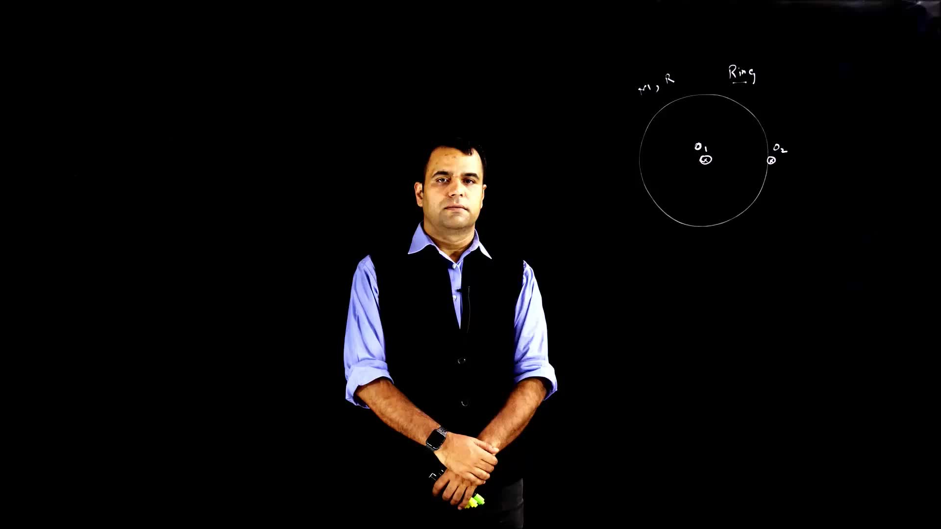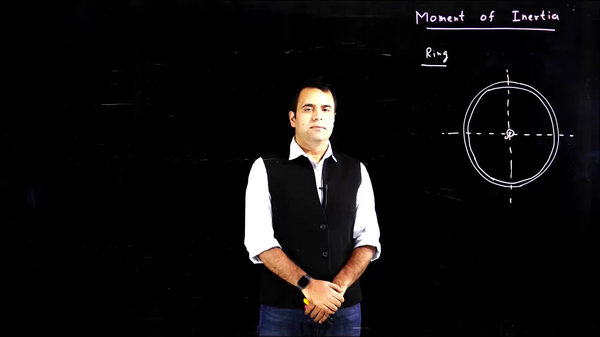 The video explains how to calculate the moment of inertia for a ring about a specific axis using the parallel axis theorem.
