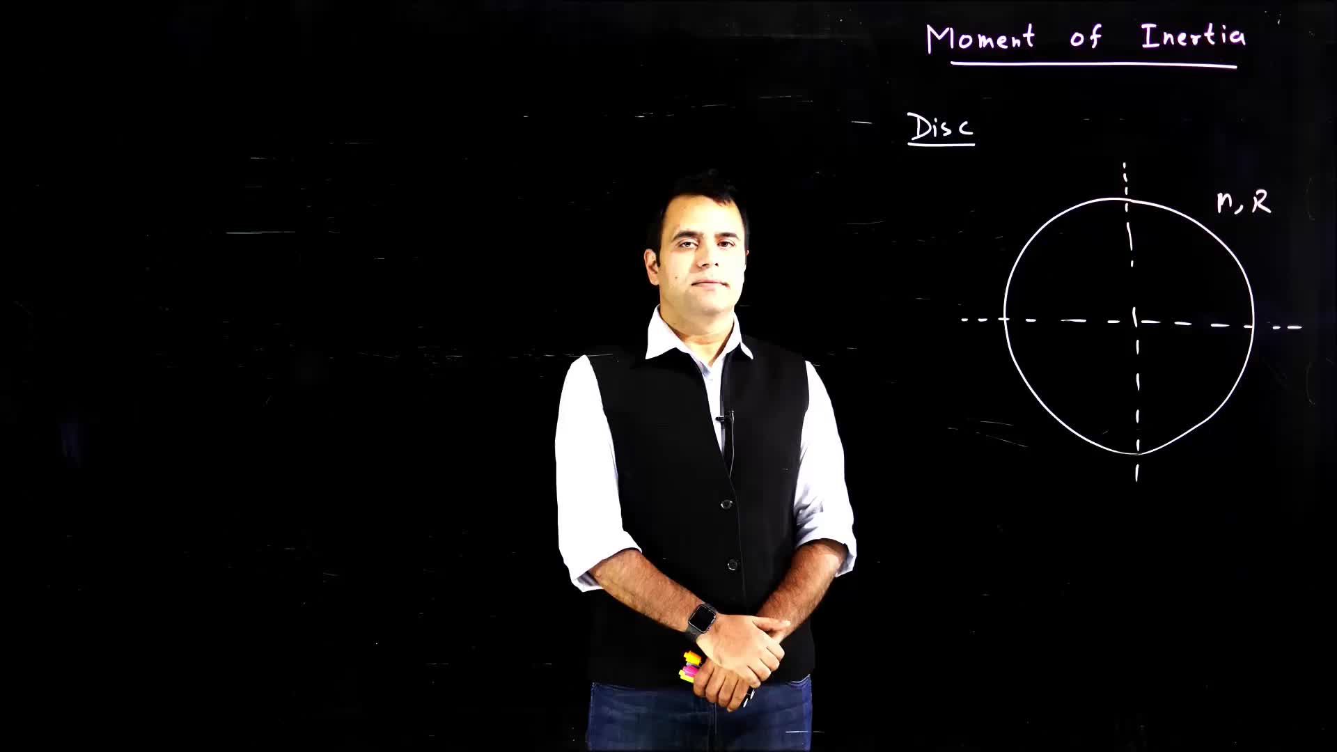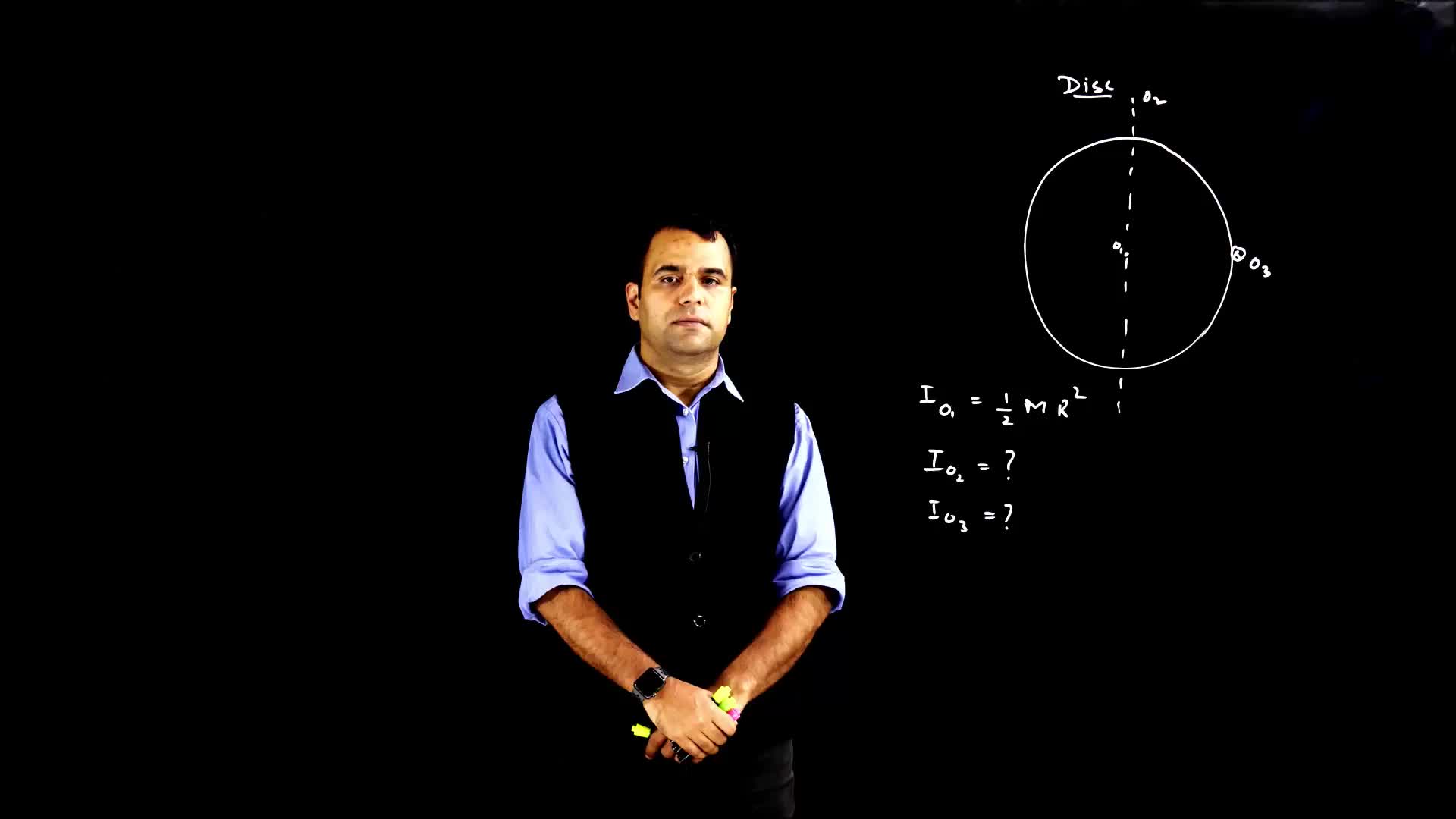 The video discusses the calculation of the moment of inertia for a disk about different axes using the perpendicular axis theorem and parallel axis theorem.