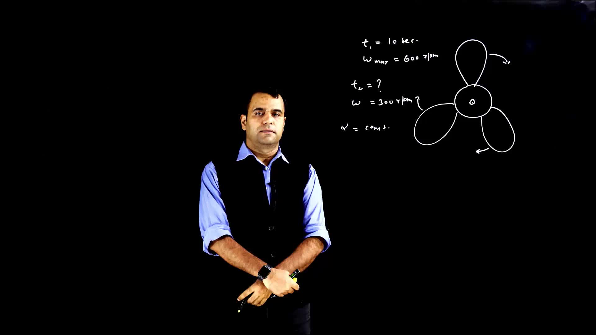 The video explains the rotation of a fan and how to calculate the time it takes for the angular velocity to become half of the maximum speed. The constant angular acceleration is used to solve the problem.