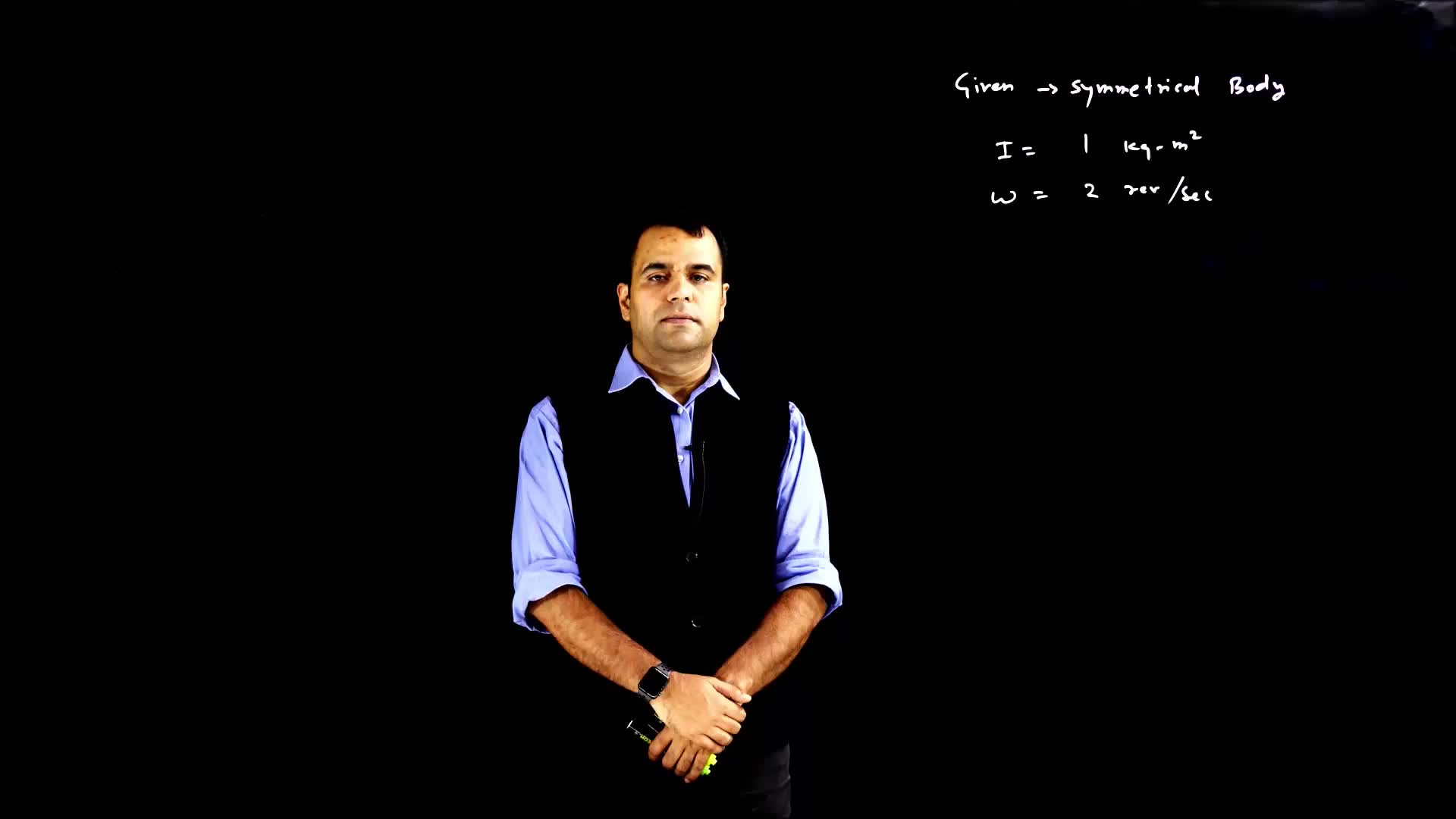 Explanation of how to calculate the angular momentum for a symmetrical body given the moment of inertia and angular velocity, including the conversion of angular velocity from revolutions per second to radians per second.