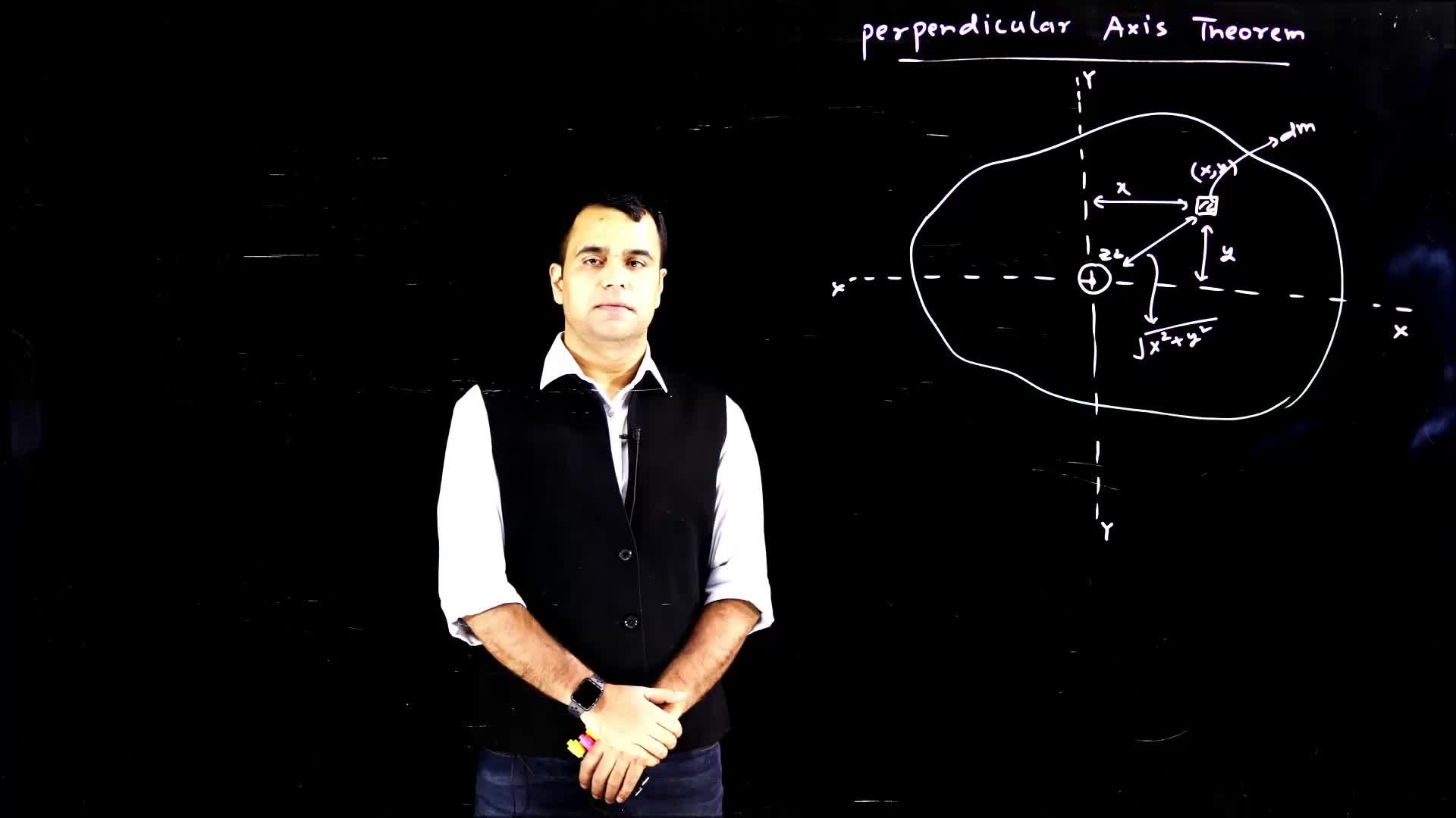 The video explains the Perpendicular Axis Theorem, which is used to calculate the moment of inertia for a body about multiple perpendicular axes. It outlines the conditions for applying the theorem and demonstrates the relationship between the three mutually perpendicular axes. The video also goes into the mathematical calculations involved in determining the moment of inertia for each axis.